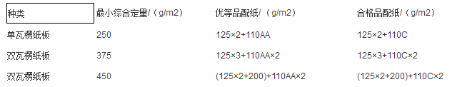 對于雙(shuāng)瓦楞紙闆,最小(xiǎo)綜合定量=面紙(zhǐ)+中紙+裏紙的定(ding)量之和。